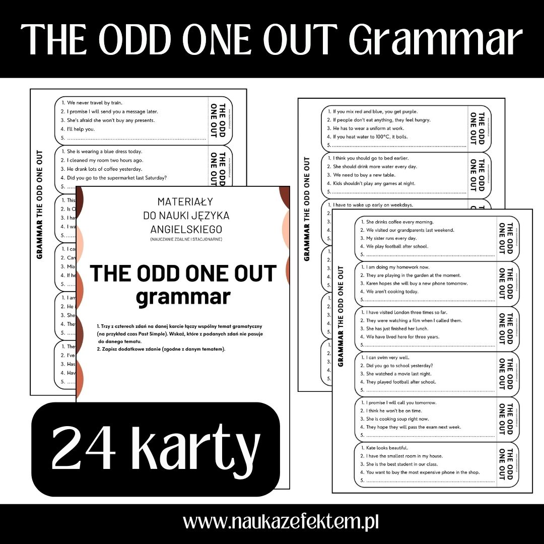 1. Trzy z czterech zdań na danej karcie łączy wspólny temat gramatyczny (na przykład czas Past Simple). Wskaż, które z podanych zdań nie pasuje do danego tematu.